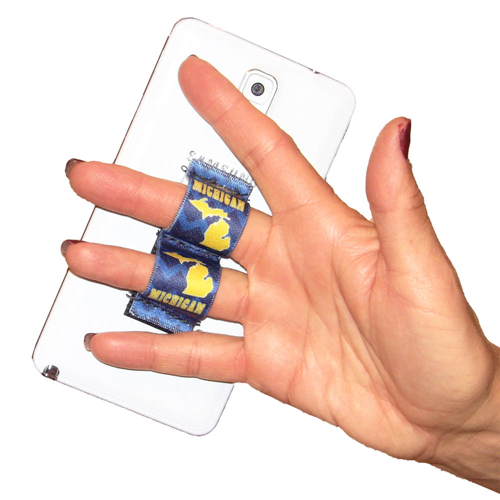 - Removable finger grip. Includes 1 2-loop thumbs-free grip and 1 adhesive-backed loop strip.